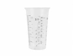 Градуированный стакан со шкалами 2:1, 3:1, 4:1, 5:1. Изготовлен из прозрачной пластмассы с хорошо читаемой шкалой, позволяющей легко смешивать краски и лаки в пропорциях, согласно необходимой пропорции. Стакан имеет закругленные края, что позволяет легко переливать содержимое в бачок покрасочного пистолета.